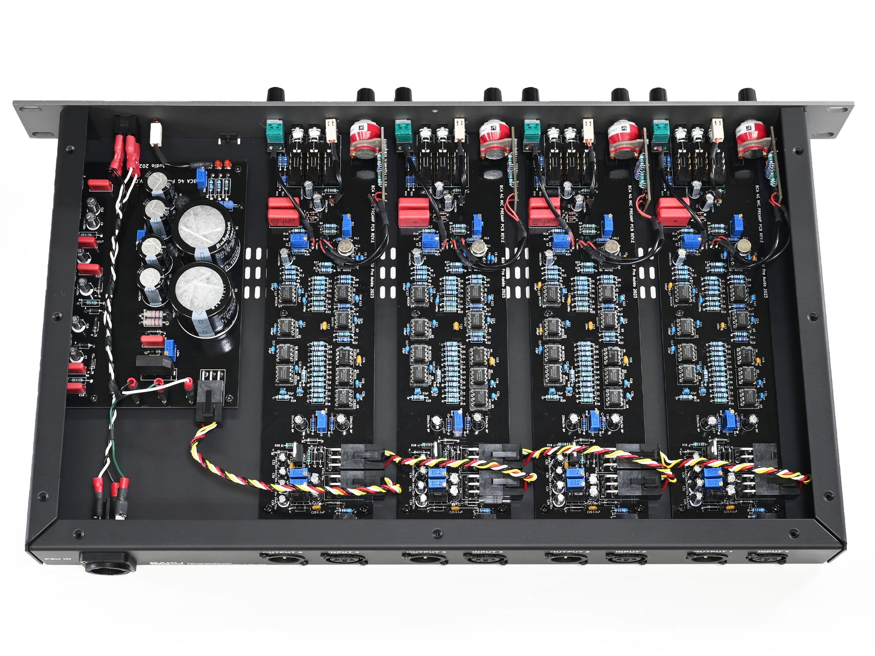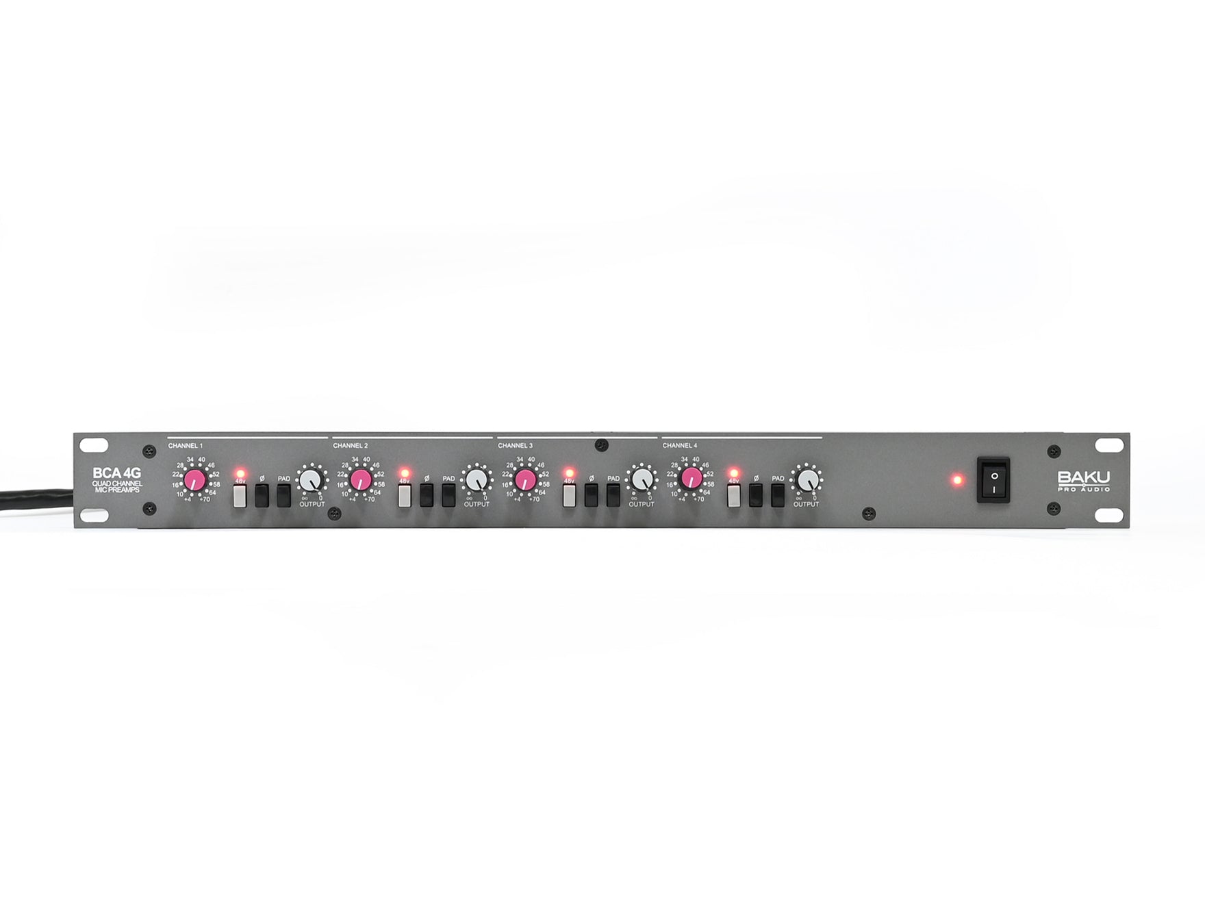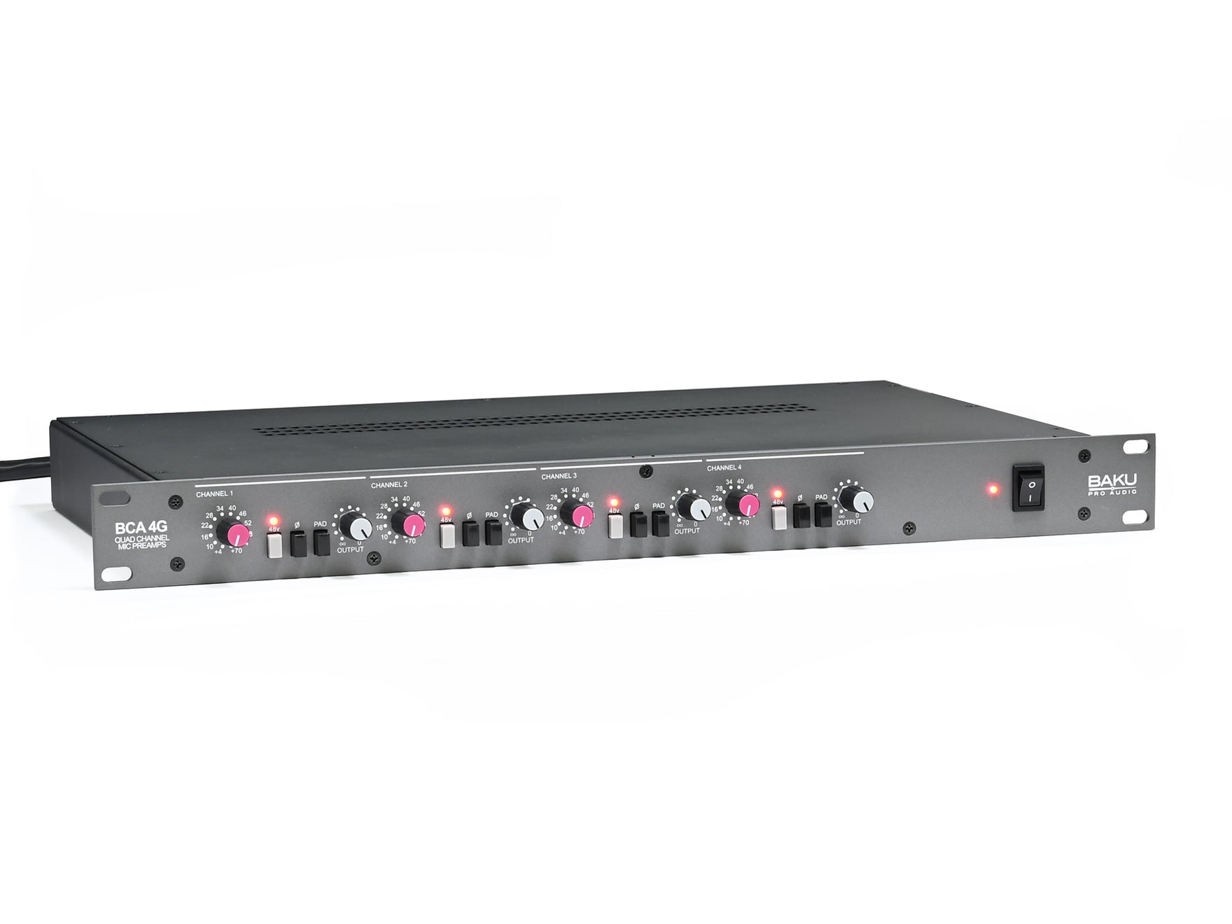 BCA4G は1980年代に発売された Solid state logic(SSL) SL4000Gシリーズ Mixing console のMIC PREAMP部をモチーフに、持ち歩ける SSL SL4000Gシリーズというコンセプトのもと BAKU Pro Audio にて再構築しリビルドした4ch MIC PREAMPです。
