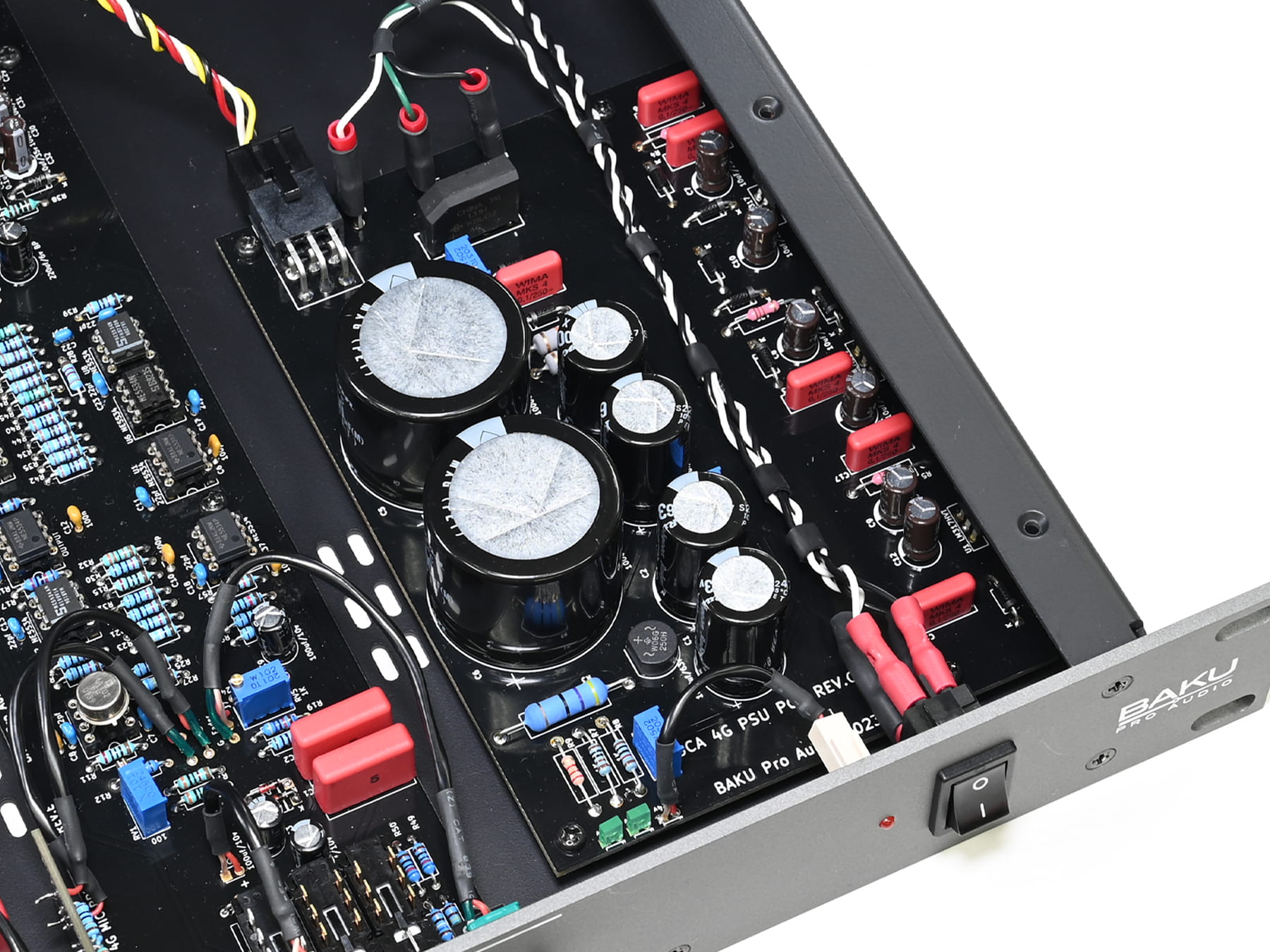 電源部はリニア方式で設計、BAKU Pro Audio 500VPR 2x4 と同じ独自の電源回路を採用しました。